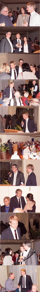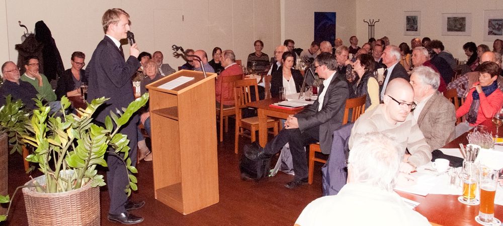 für die wichtigen Fragestellungen unseres Ortes, wie zum Beispiel die aktuelle Situation der Flüchtlinge, der dringend notwendige Wohnungsbau, der überhand nehmende Verkehr, die Gestaltung des Hollerner Sees, das breitgefächerte Kulturangebot, der nachhaltige Umgang mit den Finanzen und der visionäre Blick auf die zukünftige Entwicklung, überzeugte Sebastian Thaler vom ersten Wort an sein Publikum, das seine Ausführungen mit lang anhaltendem Applaus quittierte. Mit seiner sympathischen Ausstrahlung nahm er die Zuhörer für sich ein und überzeugte sie, dass er mit seiner Kompetenz und dem Willen, die Dinge anzupacken, das Zeug dazu hat, im Sommer 2016 den Wechsel im Rathaus als Gestalter einzuläuten. Ein Wechsel, der nicht nur ein Anliegen der SPD ist, da mehr als die Hälfte des Publikums nicht der SPD angehörten. Das zeigt, wie groß das Interesse an einem Richtungswechsel ist. Dieser scheint mit dem jungen zielstrebigen Diplom-Kaufmann möglich zu sein - die spontanen Rückmeldungen zu ihm waren unisono positiv und begeistert.
