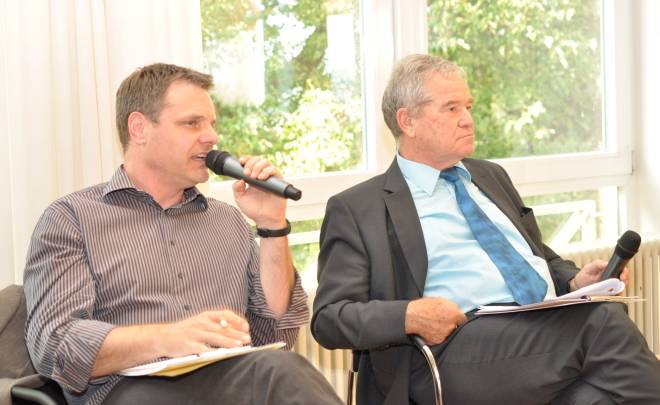 Auf dem Podium im Kardinal-Döpfner-Haus mit Alt-Landrat Manfred Pointner am 15. Juli