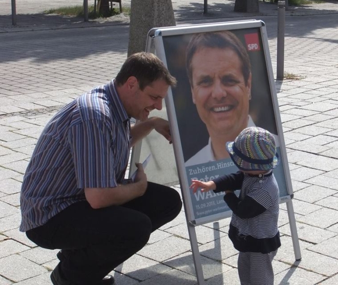 Mit Jüngstwählerin Rosalie (1,5 Jahre) am Marktplatz in Neufahrn am 24. August