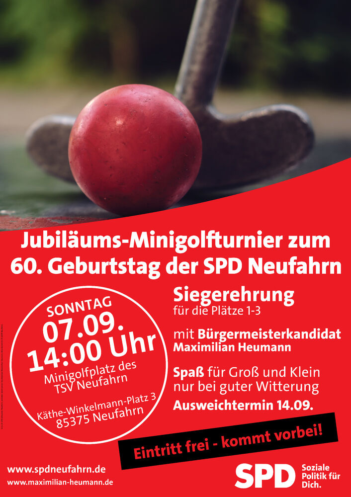 Wie schon in den letzten Jahren, veranstaltet die SPD Neufahrn auch 2025 wieder ein Minigolfturnier für große und kleine Sportskanonen.