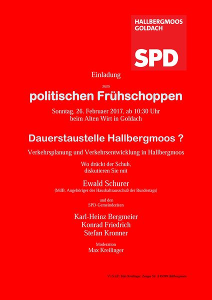 Plakat Verkehrsentwicklung Am Sonntag, 26.02. 2017 lädt die SPD Hallbergmoos ab 10.30 Uhr zum „Alten Wirt“ zum politischen Frühschoppen ein.