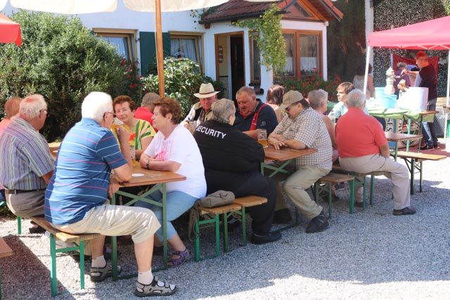 Petrus meinte es gut mit den „Roten“ , so gut dass Sonnenschirme aufgestellt werden musste um es im Freien im Schatten aushalten zu können. Dank einer Spende des Freisinger Hofbrauhauses gab es Bier und nicht alkoholische Getränke umsonst und so ließ man es sich gut gehen und genoss auf Bierbänken dank der musikalischen Begleitung der Goldacher Buam einen gemütlichen Nachmittag der sich dann bis in späten Abendstunden ausdehnte. Für das leibliche Wohl sorgten dabei Karl-Heinz Bergmeier, Konrad Friedrich und Wolfgang Brinkmann, die gut gelaunt als Grillmeister fungierten. Max Kreilinger, SPD Ortsvereinsvorsitzender und gleichzeitiger Vorsitzender ( Boss/Chef) der Goldacher Buam zeigte sich sehr zufrieden über den Verlauf des Festes und freute sich dass viele der Besucher extra per Rad, Bus oder Auto nach Notzing gekommen waren.