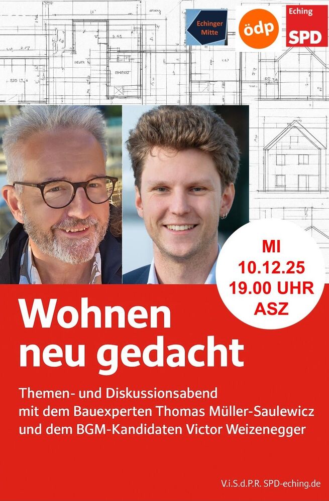 Unter diesem Motto veranstalten die SPD-Eching, die ödp-Eching und die Echinger Mitte am 10.12.2025 um 19:00 Uhr im ASZ eine gemeinsame Diskussionsveranstaltung. Referenten und Diskussionspartner werden der Bauexperte Thomas Müller-Saulewicz und unser Bürgermeisterkandidaten Victor Weizenegger sein.