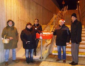 Bei eisiger Kälte und Regen überreichten wir an die Frühaufsteher unsere Lebkuchenmänner und konnten so das eine oder andere Lächeln in die verschlafenen Gesichter der Bahnfahrer zaubern. Anschließend besuchten wir noch das Alten- und Pflegeheim und verschenkten auch dort noch Lebkuchenmänner an die Bewohner. Vielen Dank an unsere Mitglieder, die bei der Verteilung geholfen haben!