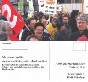 An einem sonnigen Samstagmorgen im Dezember 2011 sammeln OB-Kandidatin Eva Bönig und ihre Mitstreiter fast 300 Postkarten an Christian Ude, mit denen Bürgerinnen und Bürger ihre ablehnende Haltung gegen die 3. Startbahn zum Ausdruck bringen.