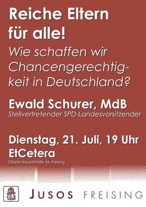 Unter dem Titel „Reiche Eltern für alle! Wie schaffen wir Chancengerechtigkeit in Deutschland?“ wollen wir über in unserer Gesellschaft ungerecht verteilte Chancen diskutieren und wie diese ausgeglichen werden könnten. Dafür haben wir Ewald Schurer, SPD-Bundestagsmitglied und Betreuungsabgeordneter für Freising und Stellvertretender SPD-Landesvorsitzender, eingeladen, der mit den Gästen diskutieren wird, wie sich das Bildungssystem oder etwa Erbschafts- und Vermögenssteuern auf die Chancengleichheit auswirken.